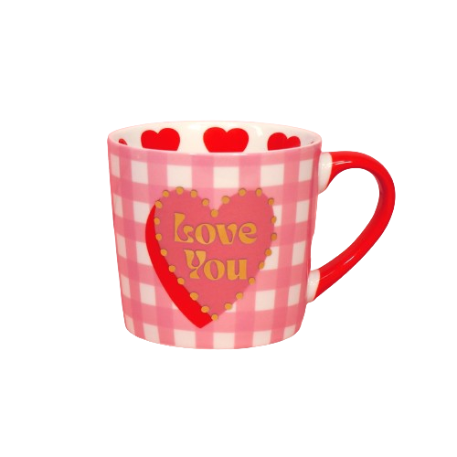 Our Love You Mug is a must-have for those looking for a sweet and thoughtful present for a loved one. Featuring a blush pink gingham pattern against a white background and illustrated retro pink and red heart with a gold 'Love You' message.