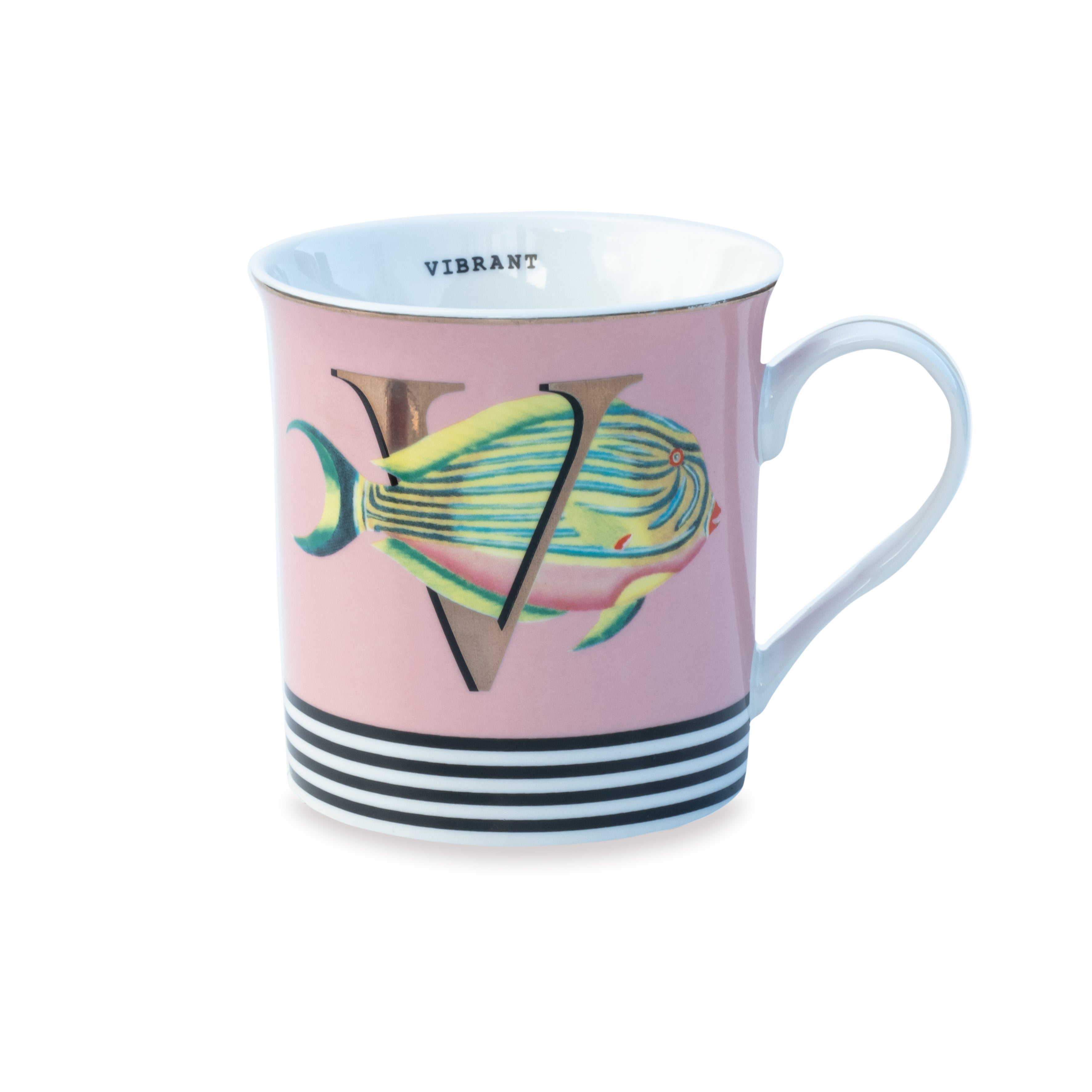 V for Vibrant, each letter of the alphabet is represented on its own mug with a beautifully-painted exotic bird or animal in a personalized initial, including a pretty poodle and crafty chameleon.