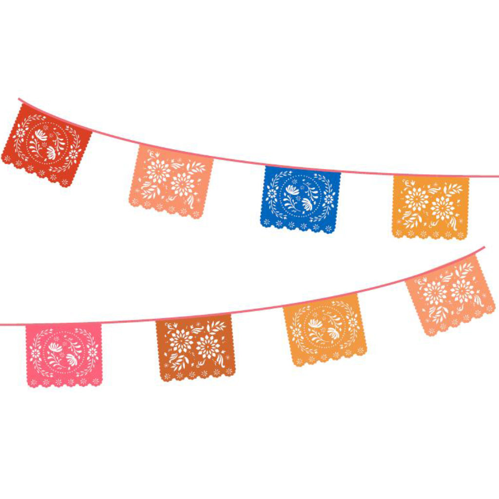 Brightly coloured boho paper bunting party decoration with 10 bunting flags and papel picado floral cut out design. Hanging party decoration for Mexican fiesta, boho birthday or summer garden party. With sticky tabs for easy, hassle free hanging.