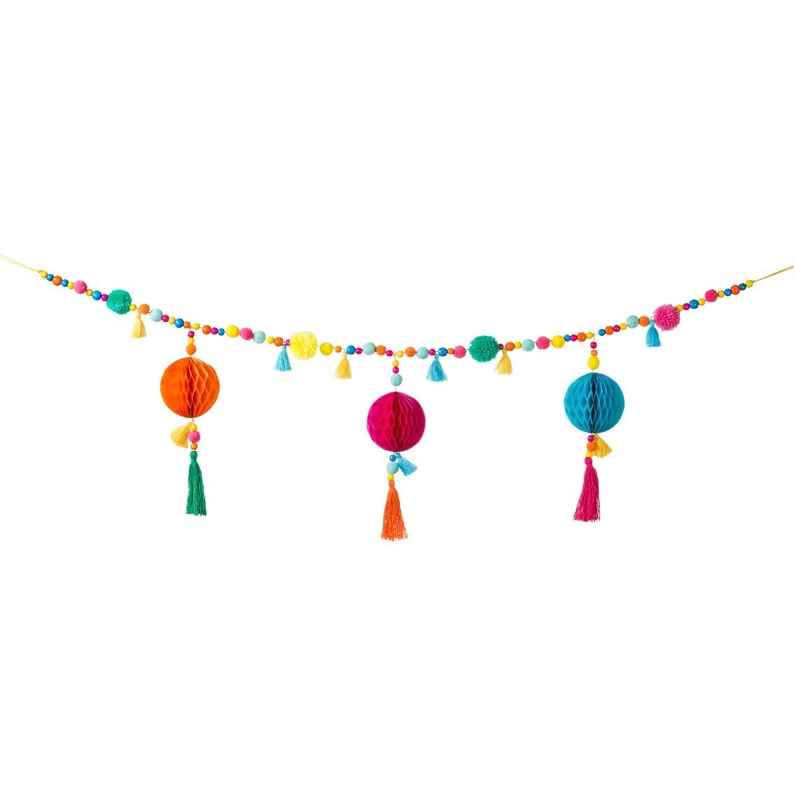 Multicoloured pom pom garland with tassel, wooden beads and paper honeycombs. Reusable boho Mexican party decoration for birthday, garden party, fiesta, Cinco De Mayo or BBQ. Hang this garland on the walls, from the ceiling or between trees. A hanging party decoration ideal for decorating your home or garden.