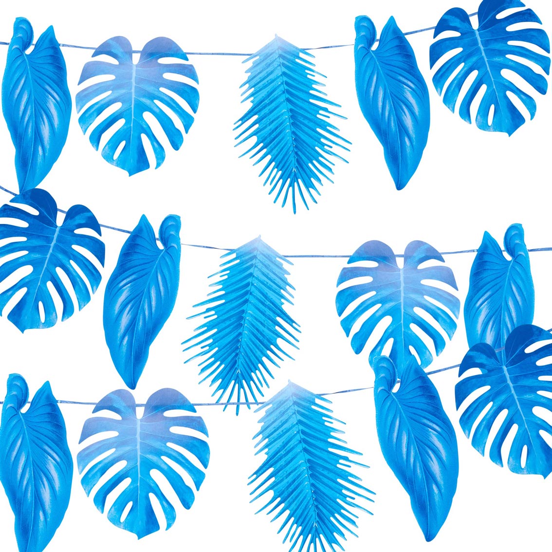 Tropical Palm Leaf Paper Garland by Talking Tables. This party decoration features 12 bright blue palm leaves in 3 different leaf shapes. This garland is double-sided, simply hang on the wall, in the garden or across the ceiling to create a tropical atmosphere that your guests will love! Perfect for a tropical themed birthday party, fiesta, Hawaiian party or summer garden party. Pair with the rest of our 'Tropical Palm' themed tableware and decorations to complete the look.
