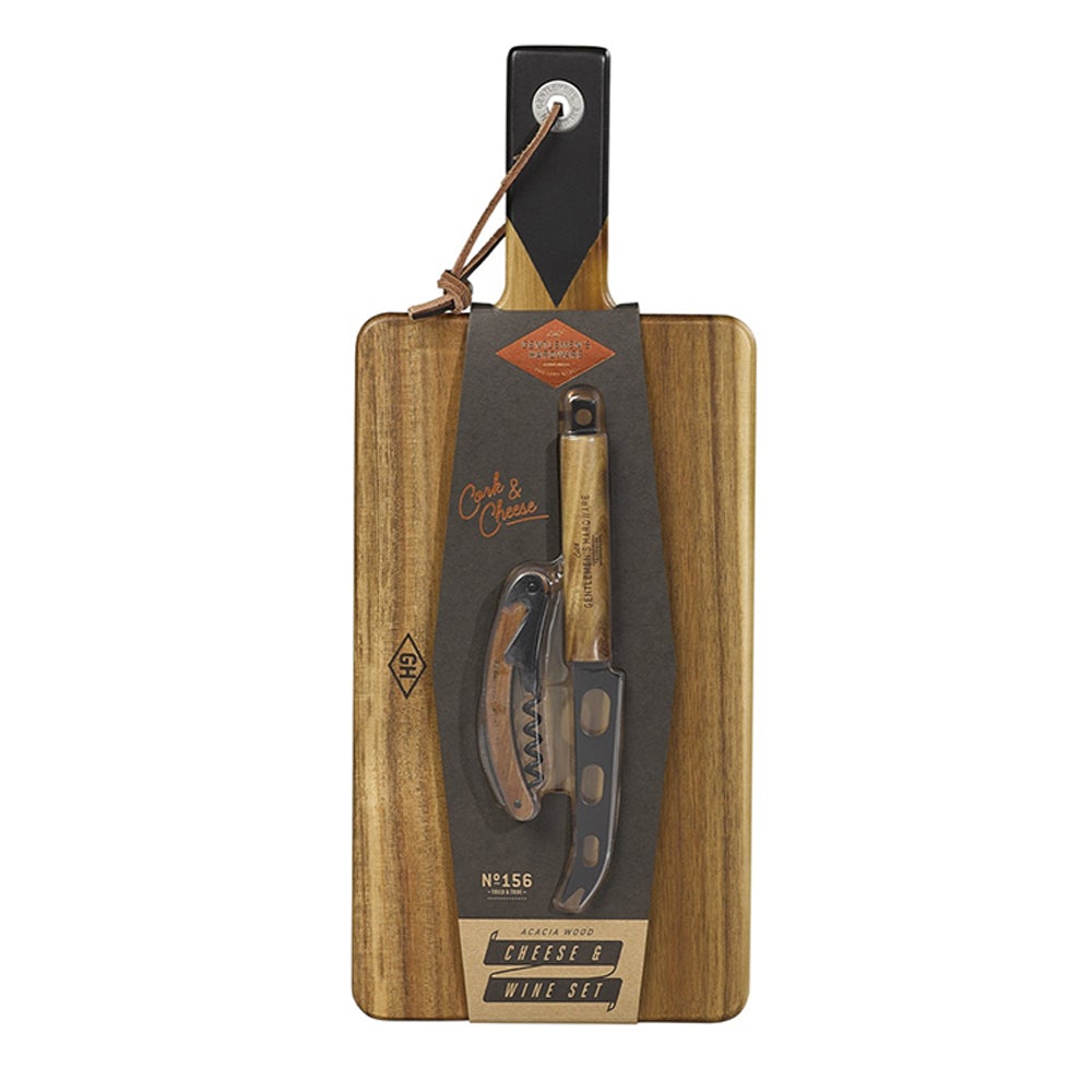 The branded acacia wood serving board is accompanied by a painted stainless steel cheese knife with a wooden handle and Gentlemen's Hardware wine opener tool with a bottle opener and corkscrew