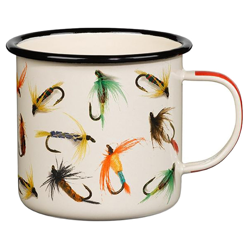Cream Enamel Mug featuring an illustrated fly fishing design.