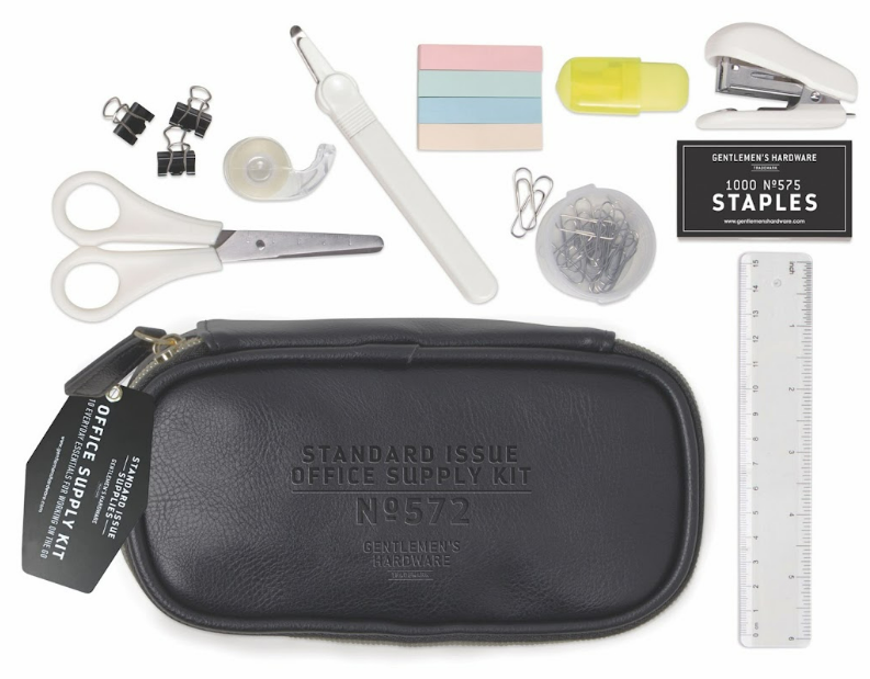 Whether on-the-go or just looking to save space, this black began leather pouch contains all of your office necessities. Cut, measure, combine, and more with our Office Supplies Kit.