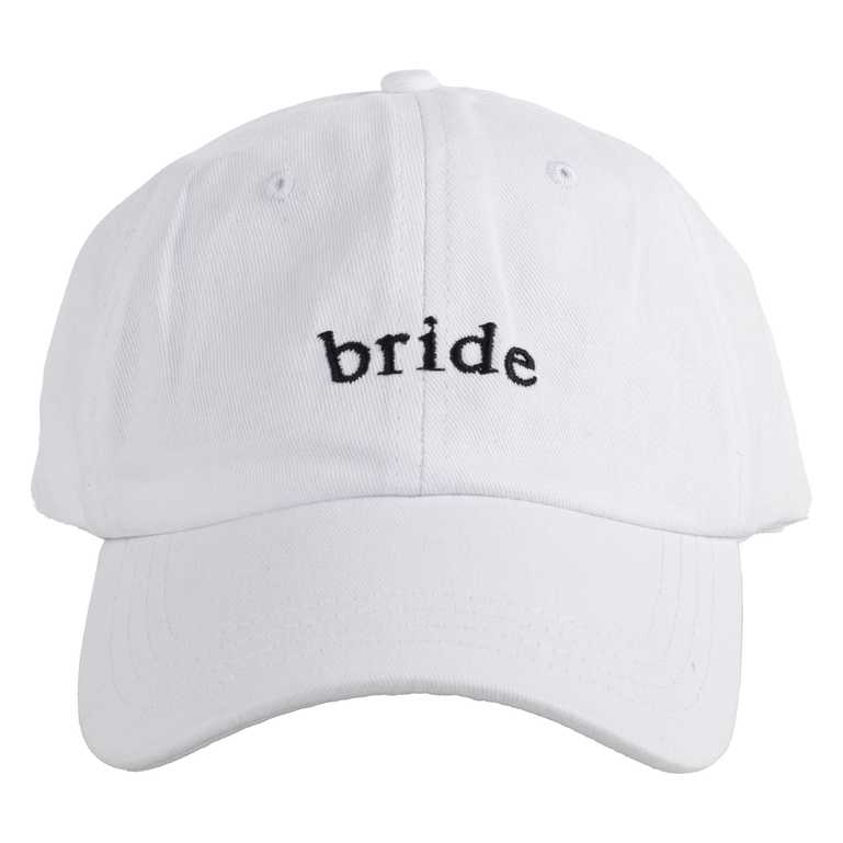 1 x White bride cap with 'bride' embroidered in black on the front, cap measures 58cm x 18cm.