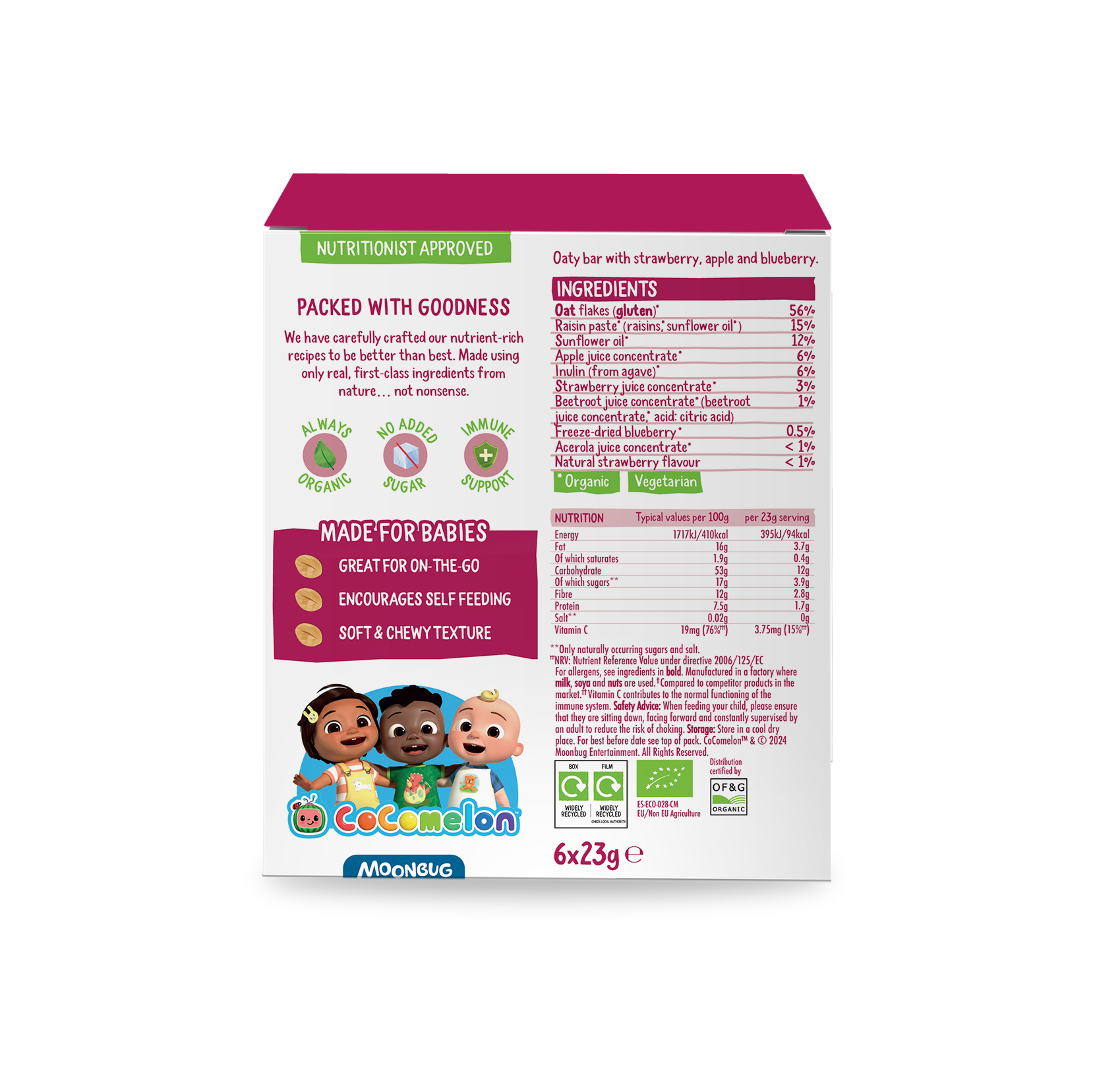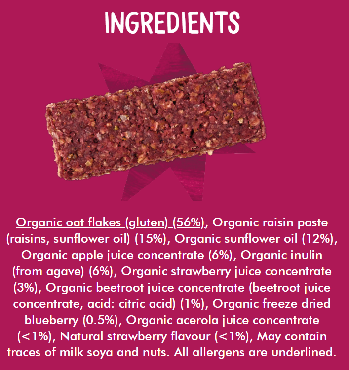 One of our most popular puree flavours made into a snack bar! Made with wholegrain oats & acerola cherry for a natural source of Vitamin C. These bars are 30% lower in natural sugars compared to other oaty bars in the market.