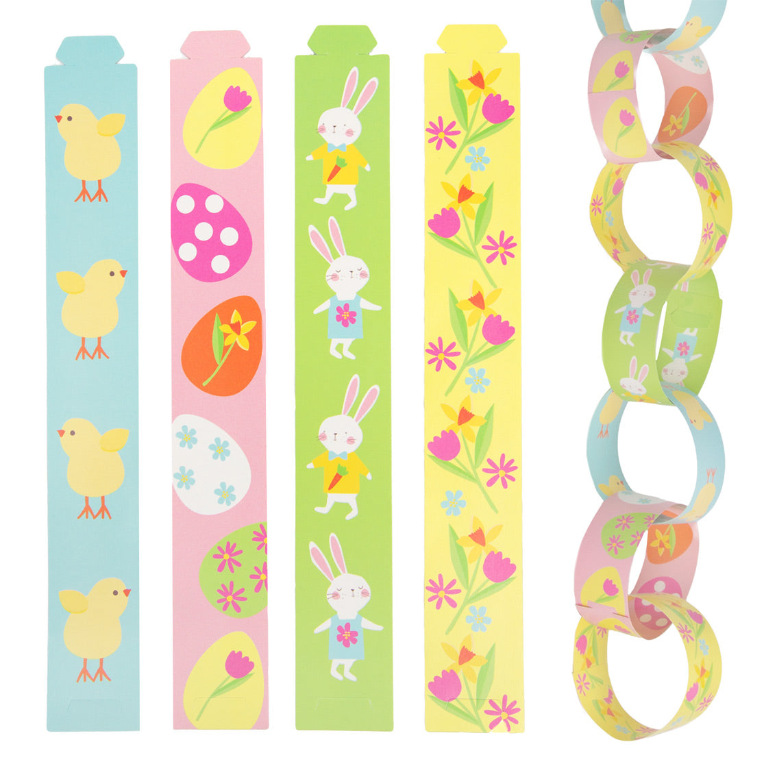Mark the start of spring and add these Easter paper chains to your stores range of Easter decorations or arts and crafts sections. A great way for customers to decorate a classroom, office or home, these paper chain decorations feature adorable Easter eggs, bunnies, chicks and spring flowers. To construct, take a strip and curl to attach the two ends together. Then, loop the next strip through the centre of the circle and attach the ends once again. Repeat until you've reached the length of chain that you want. A great arts and crafts activity for kids or adults and an eye-catching addition to any room when strung from the ceiling, door or along a mantlepiece.