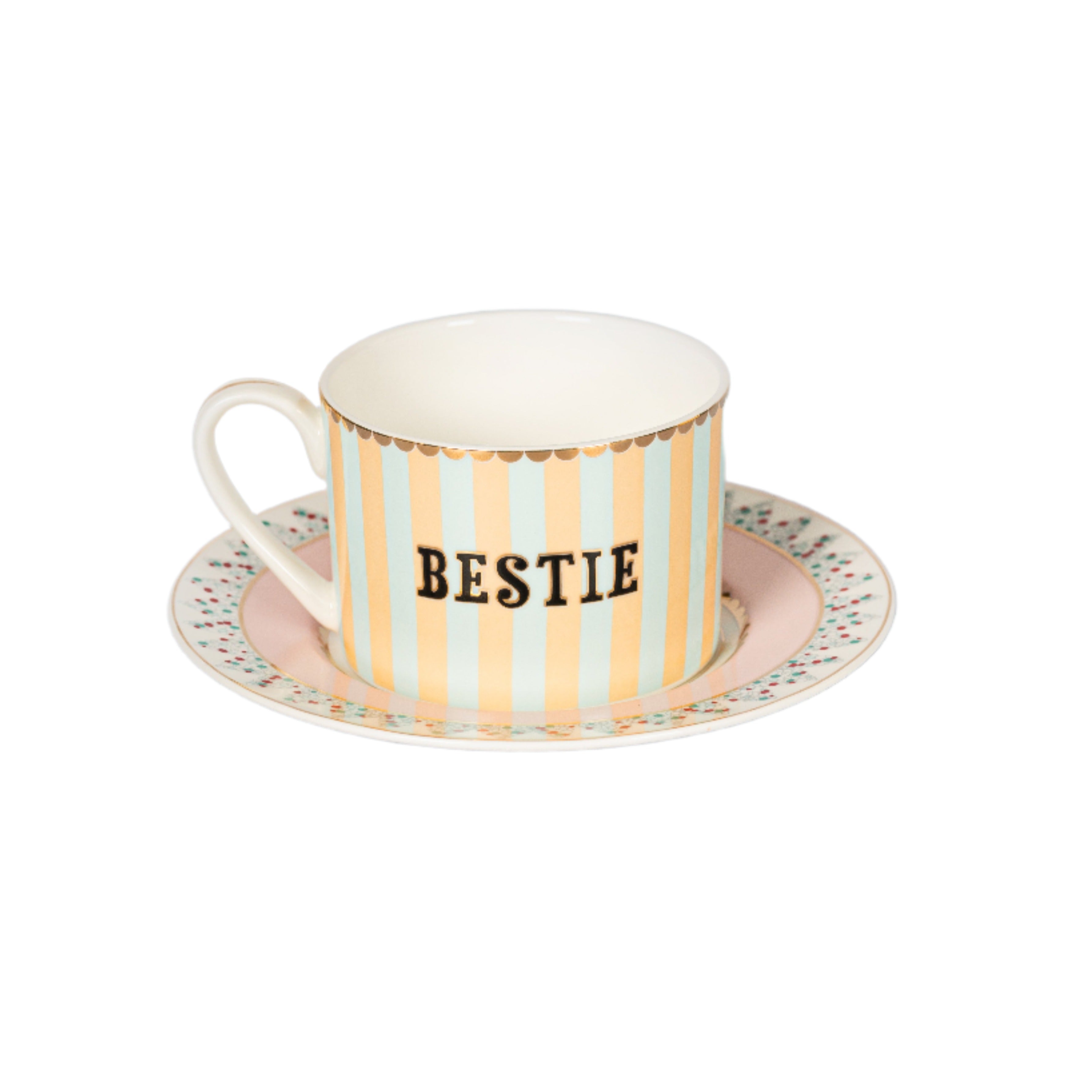 Upgrade your tea time game with the Yvonne Ellen Bestie Teacup & Saucer! Sip in style with your "partner in crime" with this retro-inspired combo, boasting a cute stripe pattern, gold accents, and two bumblebee's for you and your bestie. This set makes for the perfect present for your tea-obsessed friend!