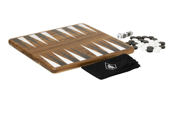 Our Wooden Backgammon Set delivers all the essentials in one place. Set this backgammon board out on display to have eye-catching coffee table decor and a game ready for guests at any time. This set includes a durable acacia wooden backgammon board, 5 dice and 30 playing pieces in a drawstring pouch, and a sturdy storage box.