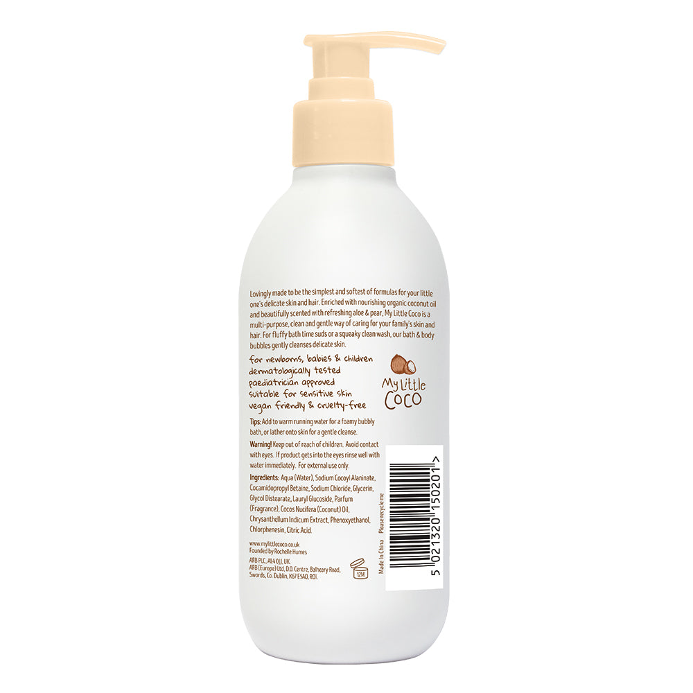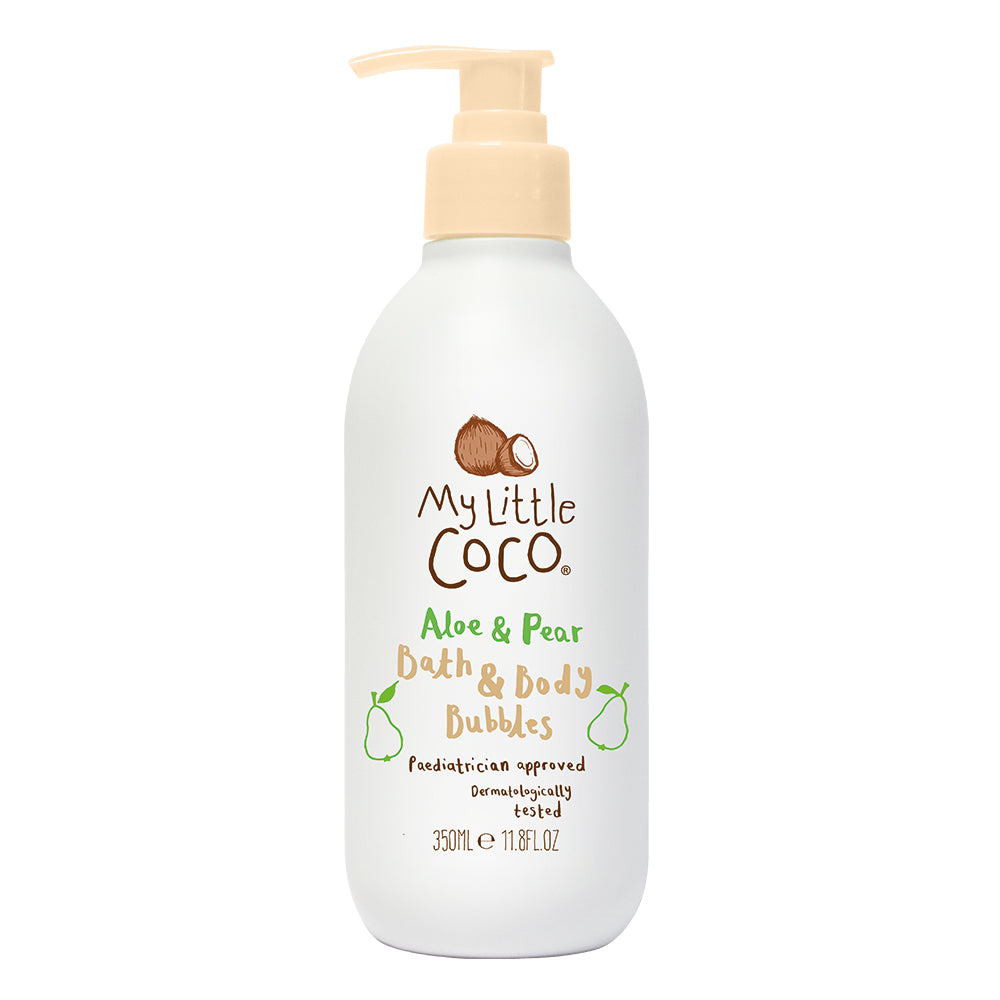 "Enriched with nourishing organic coconut oil and beautifully scented with refreshing aloe & pear. For fluffy bath time suds or a squeaky clean wash, our bath & body bubbles gently cleanses delicate skin.