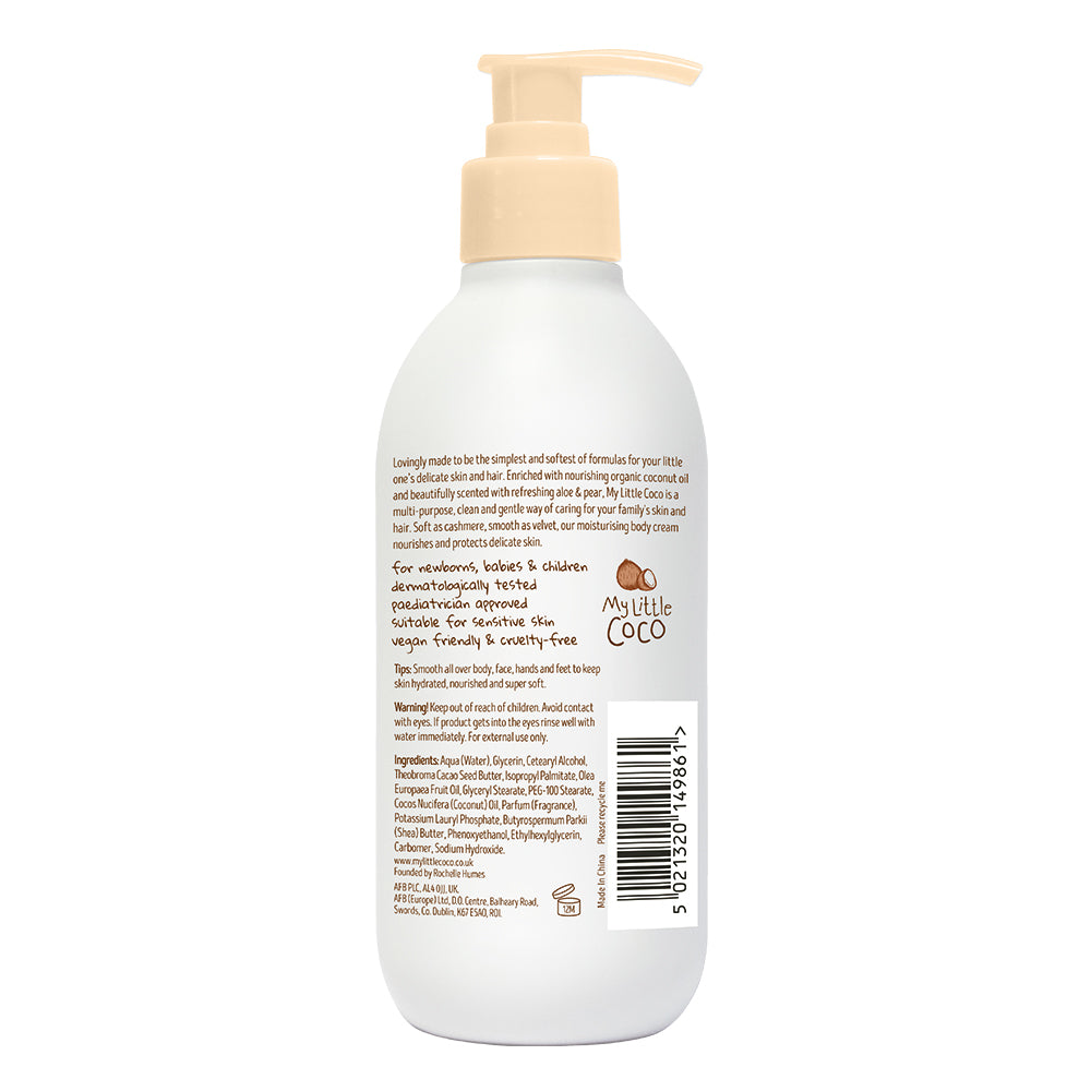 "Enriched with nourishing organic coconut oil and beautifully scented with refreshing aloe & pear. Soft as cashmere, smooth as velvet, our moisturising body cream nourishes and protects delicate skin.