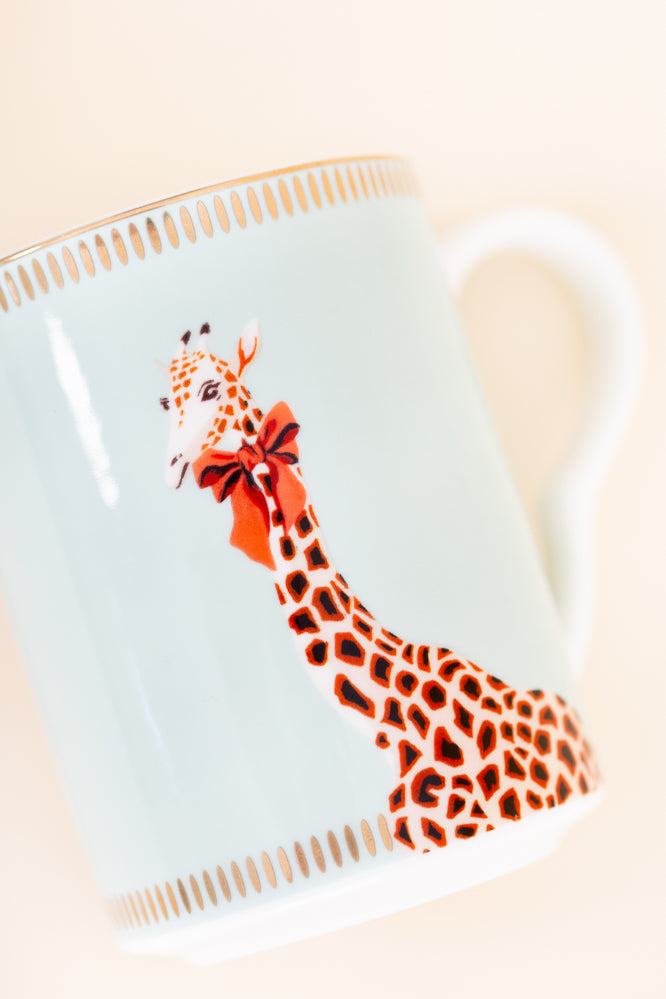 "This mug is an ideal gift for birthday's, Christmas or mothers day, a great way to celebrate your lovely mum. This large mug has a pastel pink background, a gold rim and spots for extra elegance! Our favourite giraffe and her mini me, dressed with a red ribbon around their neck, adorn the sides of the mug and there's a hidden MUM slogan inside!