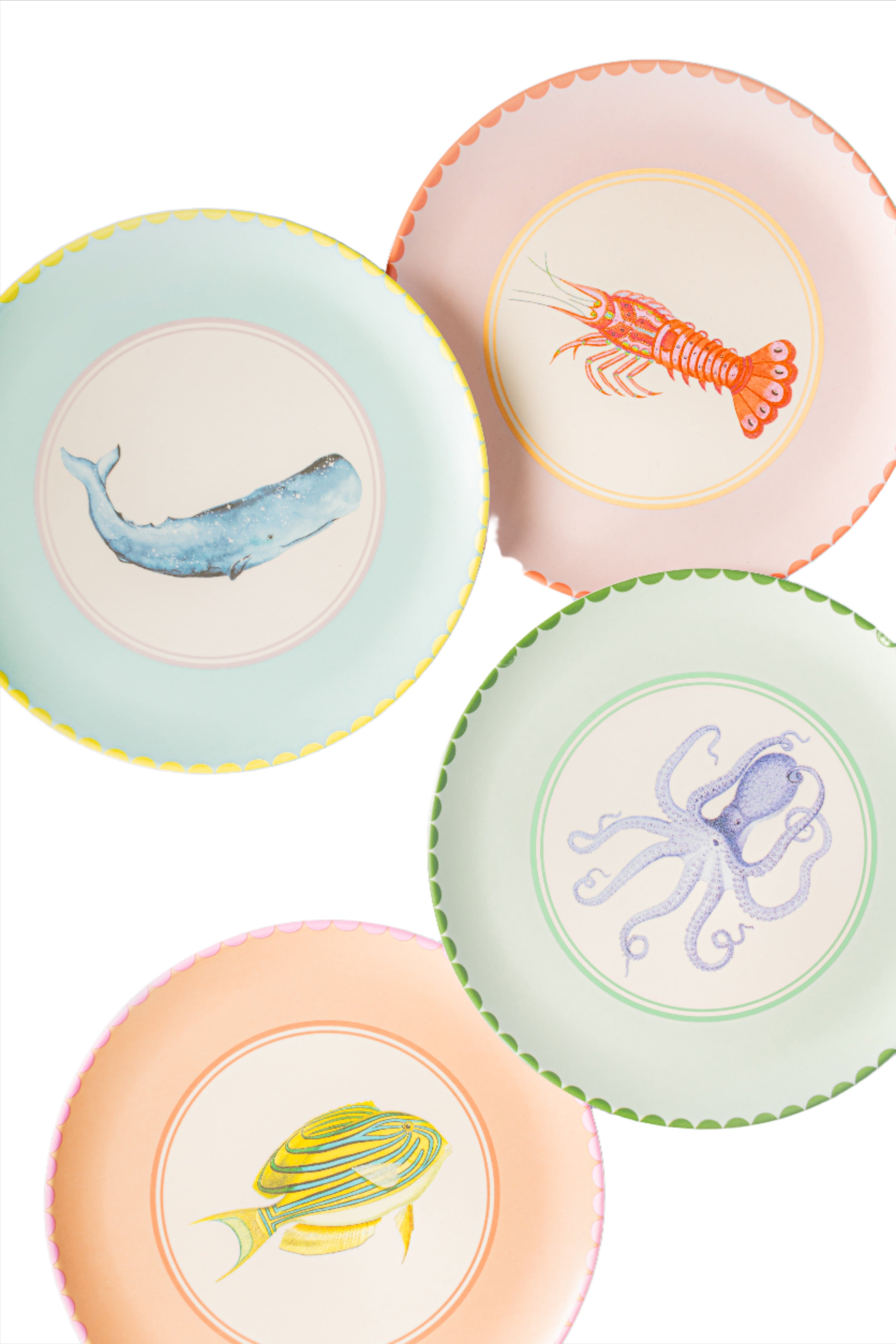 Bring a touch of under the sea to picnics and parties with these four Dinner plates. Each plate features a different shade and a Yvonne Ellen playful animal illustration. Made of shatter-resistant matt melamine, they're dishwasher safe for everyday use. Matching side plates also available.