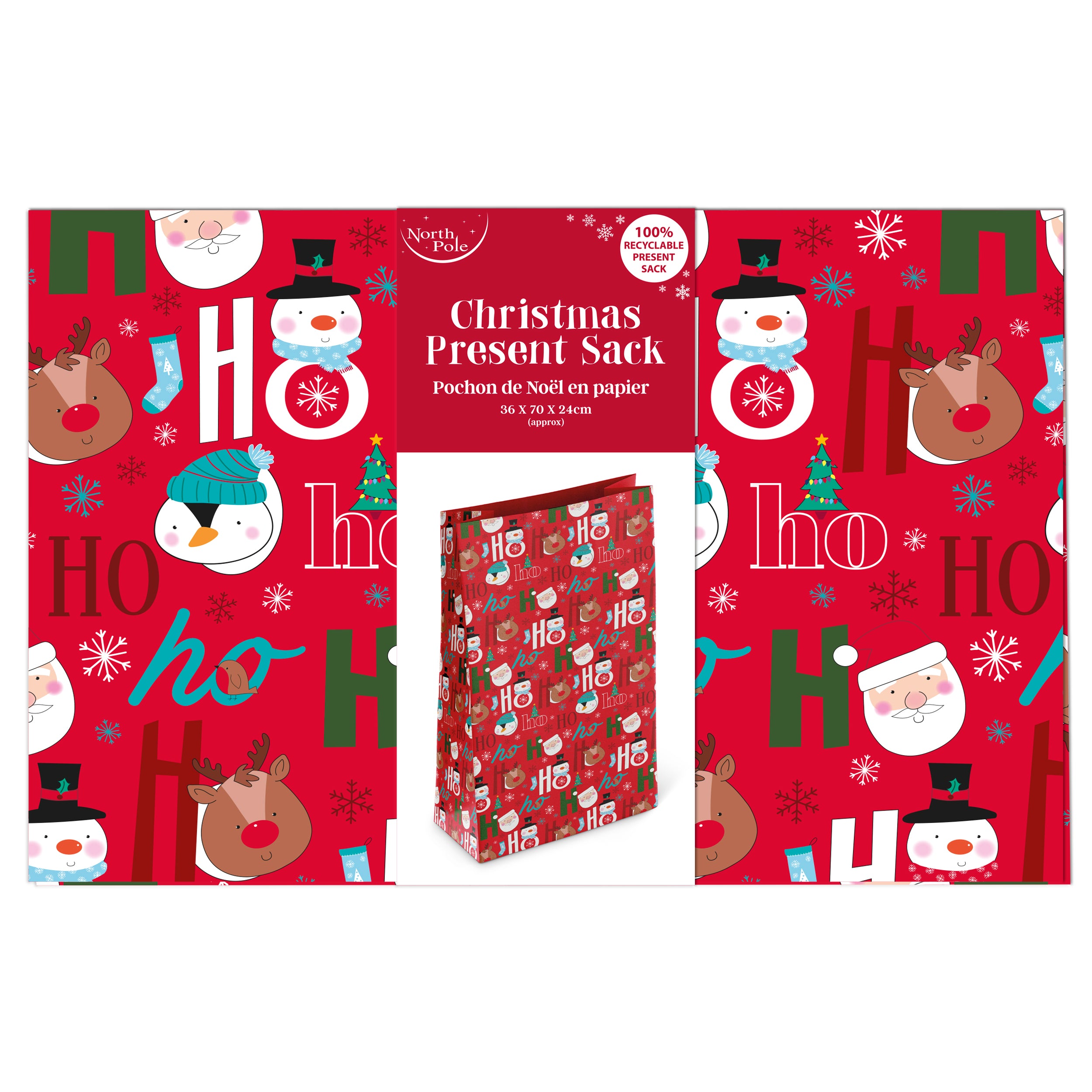 Add festive charm to your gifting with this large red present sack featuring Christmas characters and a bold “Ho Ho Ho” design. Made with a kraft paper look, it’s durable, reusable and perfect for holding bigger presents or multiple smaller gifts.