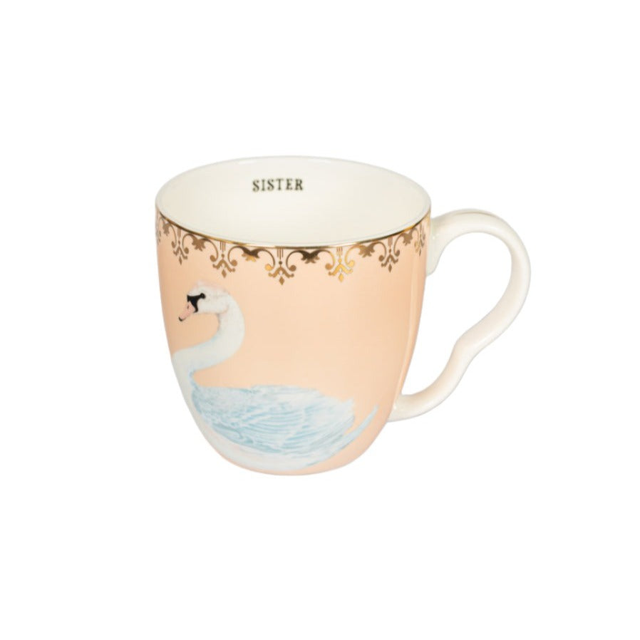This lovely mug is the perfect gift for birthdays, Christmas for your dear sister. With a soft pink background and vintage style gold rim, this large mug exudes elegance. Two adorable swans decorate the sides, while a hidden SISTER slogan adds a playful touch.