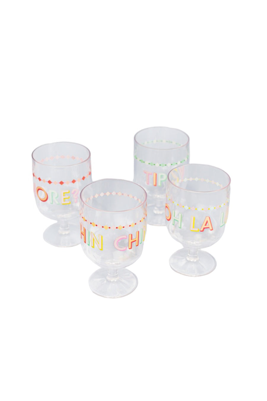 Elevate your alfresco dining experience with the Yvonne Ellen Plastic Wine Glasses. Made of clear plastic, these wine glasses feature colourful whimsy slogans to add a playful touch to your picnic or boozy gatherings. Sip in style with this elegant and versatile set of four.